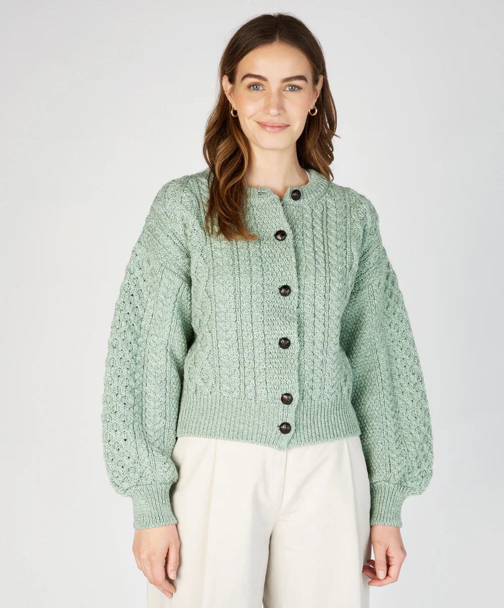 Adorned with intricate Aran stitches, this cropped cardigan features lantern sleeves, six buttons, and a stunning two-tone blend of moss and emerald green yarns.